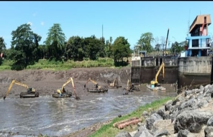 Kegiatan Flushing dengan menggunakan alat berat di bendungan Wlingi, Kabupaten Blitar.